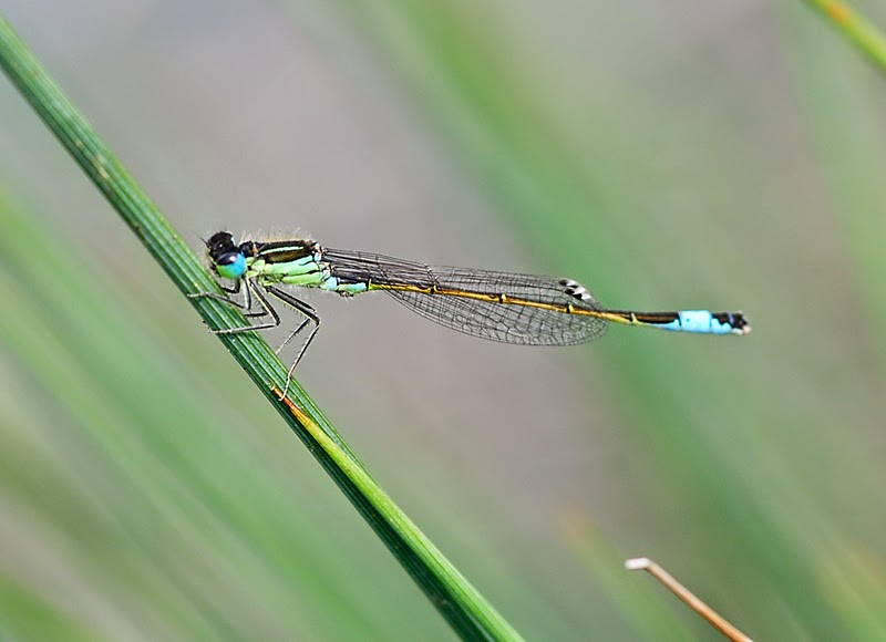 Sigo las claves dicotómicas de la página de Libellulasman. Dentro de los zygoptera, (alas anterior y posterior de la misma forma), ichnura se caracteriza por tener alas pedunculadas en la base, con el pterostigma corto y de la misma longitud que la celda adyacente, tibia no aplanada, abdomen bronce oscuro con el segmentos 8 y 9 azul cielo. Esto dos últimos segmentos diferencian las tres especies ibéricas; mientras que I. pumilo tiene el 8 parcialmente azul y el 9 totalmente azul, I elegansn y graellsii lo tienen al revés. Graellsii es más más pequeña que elegans, con la espina del pronoto menos visible y con el pterostigma bicolor más pequeño.